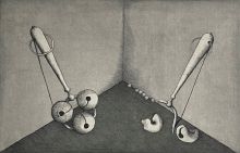 ситуации тотальной игры, полнейшего смещения и смешения логических координат в понимании предметно-пространственных, временных и психологических связей, стало залогом создания изысканных и стилистически безупречных графических циклов. Их пластический язык устойчиво балансирует на тонкой метафорической грани, метко сформулированной иллюстратором Геннадием Калиновским: «не слишком гротескно, не слишком серьезно, не слишком экстравагантно, не слишком исторично».