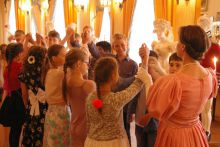 15-тиминутных «уроков» в программе 5, в нашем случае порядок был следующий: танцы (ох, и суров педагог), русская словесность, французский язык, перешедший в разговор об этике и правилах поведения (ооочень актуальный), переменка на экспозиции, а потом рисование и фехтование. Музей красивый, просторный, наша огромная группа нигде не толкалась и не теснилась. Не стеснялись учиться танцевать, не боялись пробы пера, рисовали карикатуры, смело изобличали самих себя в вопросах этики и поведения, смеялись над собой. Ну, а фехтование – просто изюминка программы (и шпаг всем хватило:). Очень приятное дополнение - «Свидетельство об успехах» каждому участнику. А еще мармелад. И все за 400 рублей!