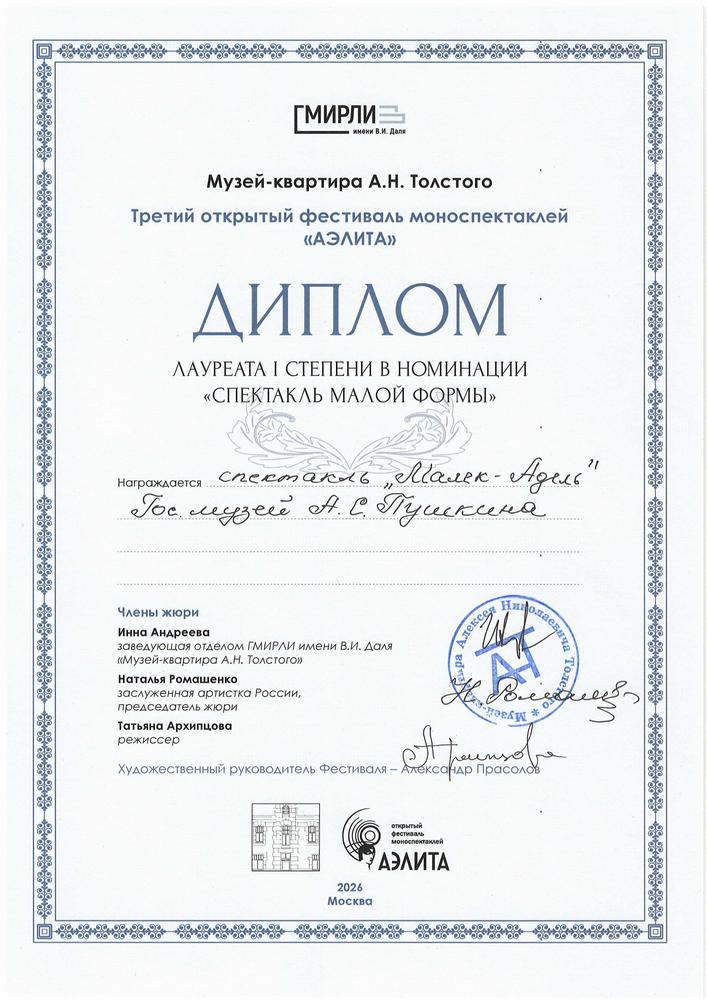 Дорогие друзья! С большой радостью и гордостью сообщаем: спектакль «Малек-Адель», поставленный в рамках музейно-театрального проекта Государственного музея А.С. Пушкина, принял участие в конкурсной программе московского камерного театрального фестиваля и получил сразу две высокие награды!