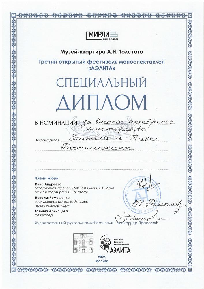 Несколько лет назад их, недавних выпускников ГИТИСа, увидел, оценил и пригласил в свой новый спектакль Андрей Беркутов, режиссер-постановщик музейно-театрального проекта Государственного музея А.С. Пушкина. «Малек-Адель» по рассказам И.С. Тургенева из его «Записок охотника» был поставлен к 200-летию писателя. К большому сожалению, этот спектакль стал последним из одиннадцати, поставленных Андреем Беркутовым на площадках нашего музея. Четыре года назад режиссер скоропостижно ушёл из жизни, что стало большой, невосполнимой потерей для музейно-театрального проекта ГМП. Но его последний спектакль продолжает жить на сцене музея и до сих пор пользуется особой зрительской симпатией. Данила и Павел Рассомахины, которые очень любят своего «Малек-Аделя», при любой возможности с радостью играют его в интерьере Музея И.С. Тургенева на Остоженке. А теперь этот спектакль стал ещё и победителем театрального фестиваля! Это ли не лучший дар светлой памяти и признательности талантливому режиссеру Андрею Беркутову, памятный день которого музей отметит 6 февраля.