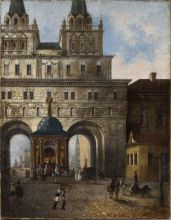 Композиция восходит к литографии А.Ш. Мюллера, изданной Дациаро в серии «Виды Москвы» в 1846 году. В основе литография лежит рисунок В.О. Вивьена 1840-х гг., художника и архитектора, сына И.И. Вивьена, автора миниатюрного портрета А.С. Пушкина 1826 года.На картине изображены Иверские ворота, которые получили название от хранящейся в часовне копии чудотворной иконы Божьей Матери из Иверского монастыря на горе Афон. Это были парадные ворота Китай-города на Тверской дороге в Москве - через них происходил въезд государей и иностранных послов в Кремль. А.С. Пушкину, родившемуся и неоднократно бывавшему в Москве на протяжении всей своей жизни, эти ворота хорошо были известны.