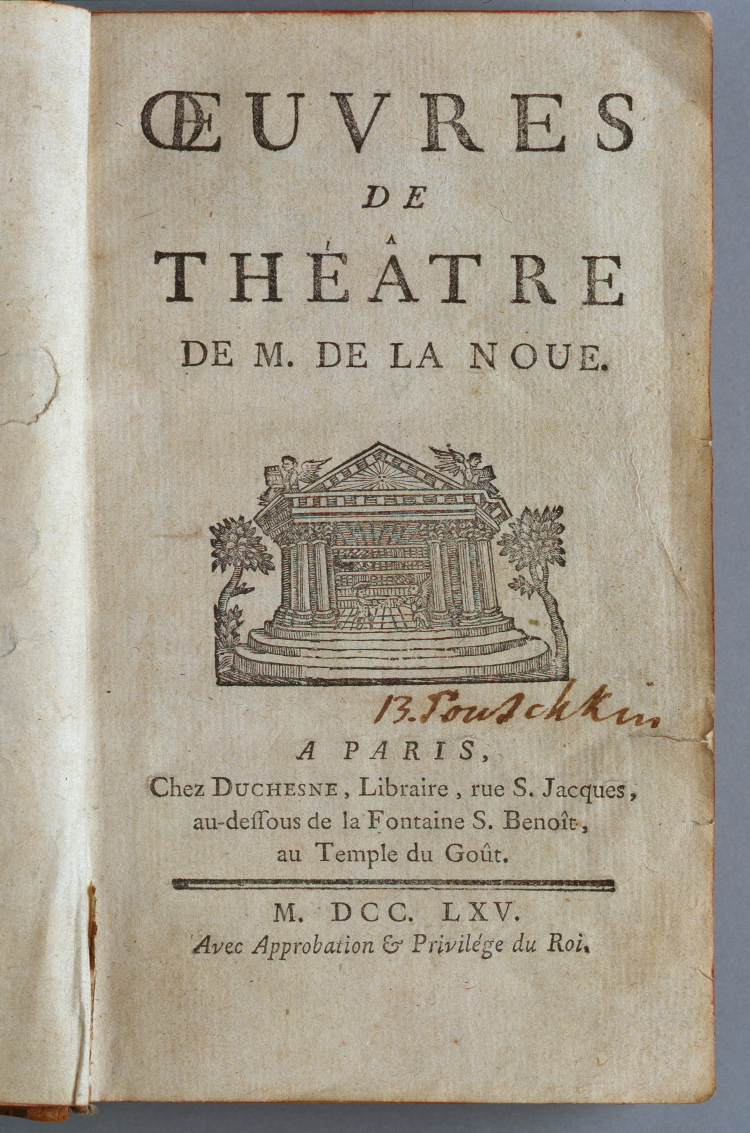 Это единственное прижизненное издание стихотворений В.Л. Пушкина. После выхода книги в свет близкий друг автора, журналист и поэт, князь П.И. Шаликов, написал: «Для славы литературы нашей должно желать, чтобы гораздо чаще выходили у нас такие книжки, которые оцениваются знатоками не по числу листов, но по другому достоинству, и которые заслуживают известное преимущество быть в руках у каждого человека со вкусом и просвещением». Книга была подарена автором неизвестному нам лицу – на титульном листе ее сохранился автограф: «… в знак искреннейшаго почитания и преданности Сочинитель».«Театр г-на де Лану». Париж. 1765–1767