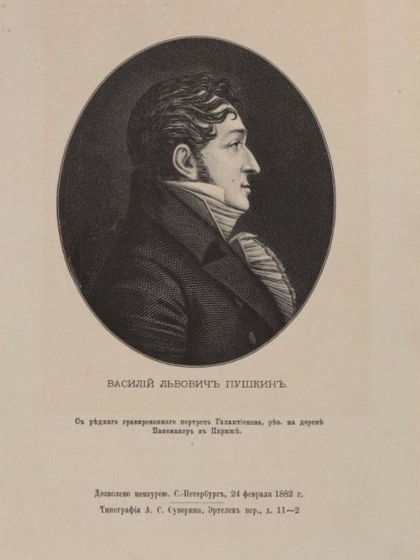 Василий Львович Пушкин родился в Москве в 1766 году. Получил блестящее домашнее образование; непродолжительное время служил в Измайловском полку в Петербурге. После удачного дебюта на поэтическом поприще – публикации стихотворения «К камину» в журнале «Санкт-Петербургский Меркурий», в 1796 году он вернулся в Москву. Остроумного собеседника, талантливого поэта и декламатора, его с удовольствием принимали во многих московских домах. В 1803 году В. Л. Пушкин совершил заграничное путешествие, посетив Германию, Францию и Англию, где был принят известными европейскими писателями; перевел на французский язык и напечатал в парижском журнале русские народные песни; побывал в крупнейших музеях и театрах. Из путешествия он привез прекрасную библиотеку.