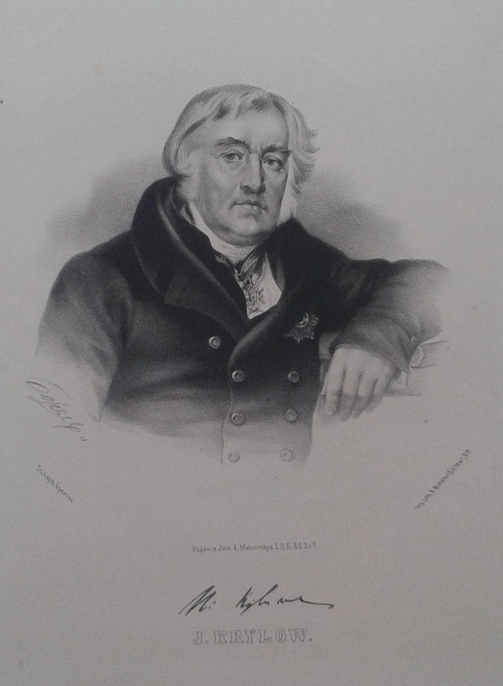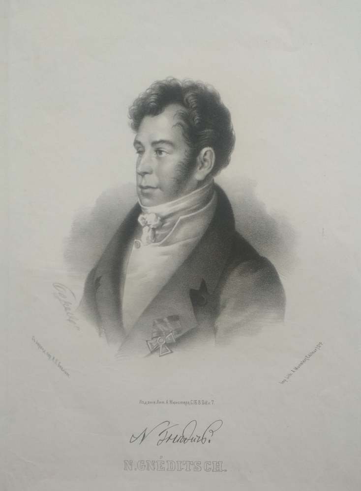 Следующий зал выставки составили экспонаты, связанные с двумя старшими современниками Пушкина – с Иваном Андреевичем Крыловым и Николаем Ивановичем Гнедичем. Знаменитого баснописца и переводчика «Илиады» объединяло многое. Они оба были заметными фигурами в литературном мире, оба служили в Императорской публичной библиотеке и жили по соседству. По словам современника, «одна и та же лестница, мимо Крылова, вела наверх, в квартиру Гнедича. Удобство сообщения, холостая жизнь обоих, любовь к литературе и равные отношения к гостеприимному дому Олениных тесно связали поэтов». Похоронены они также были рядом – на Тихвинском кладбище Александро-Невской лавры. Пушкинские строки, адресованные Гнедичу и Крылову, позволяют лучше понять и личность каждого из них, и характер их отношений с Пушкиным.